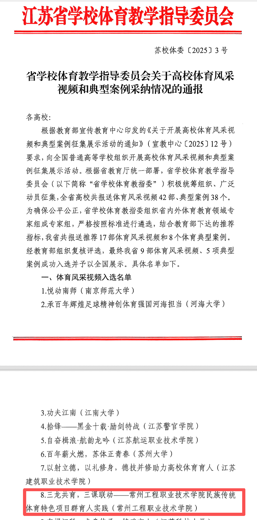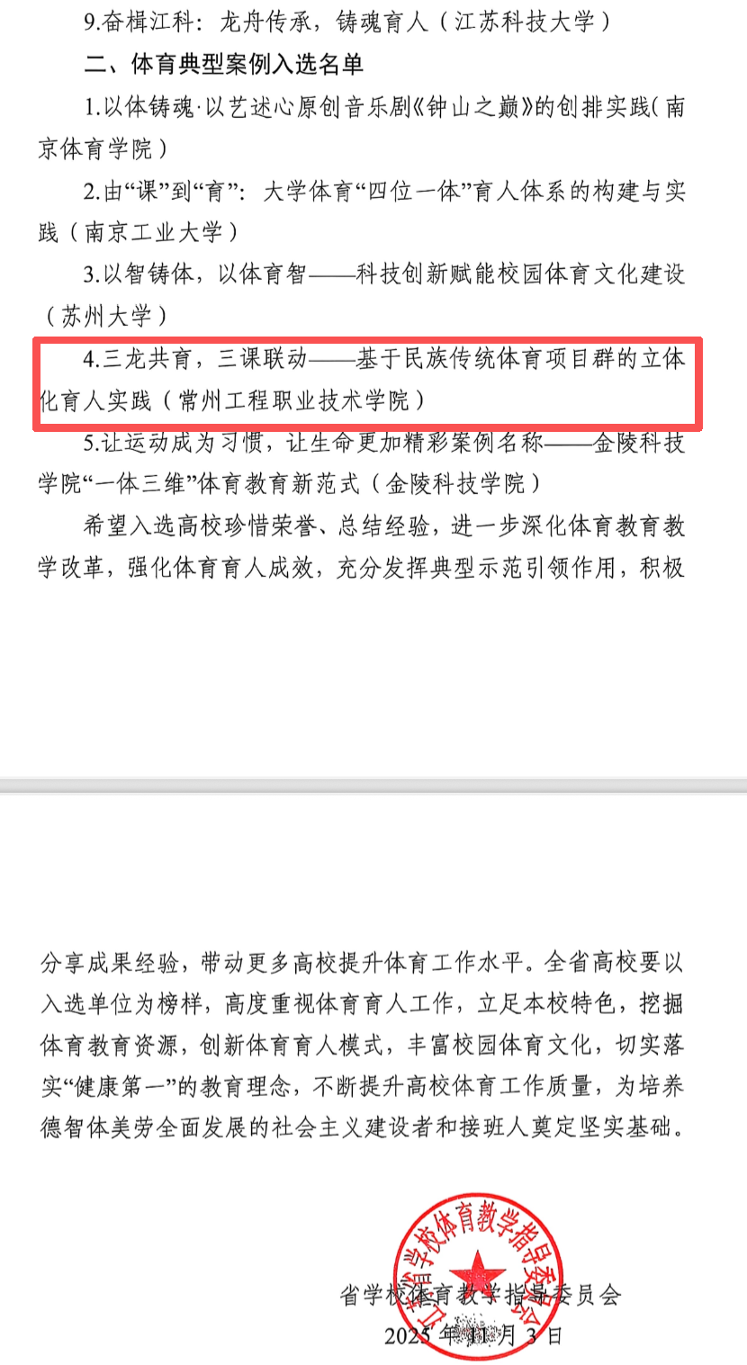 此次双项入选,是对学校长期以来坚持特色发展、深化体育教育改革成果的高度肯定。学校将以此次荣誉为新的起点,进一步总结提炼民族传统体育育人经验,持续深化“三龙共育”项目内涵建设,推动体育教学与校园文化、专业教育协同发展,不断提升体育育人实效。推动体育育人模式创新,为培养德智体美劳全面发展的时代新人贡献更多智慧与力量。(伟德国际1949 文图:冒辰辰 审核:陈瑜、刘会平、印罗观)
